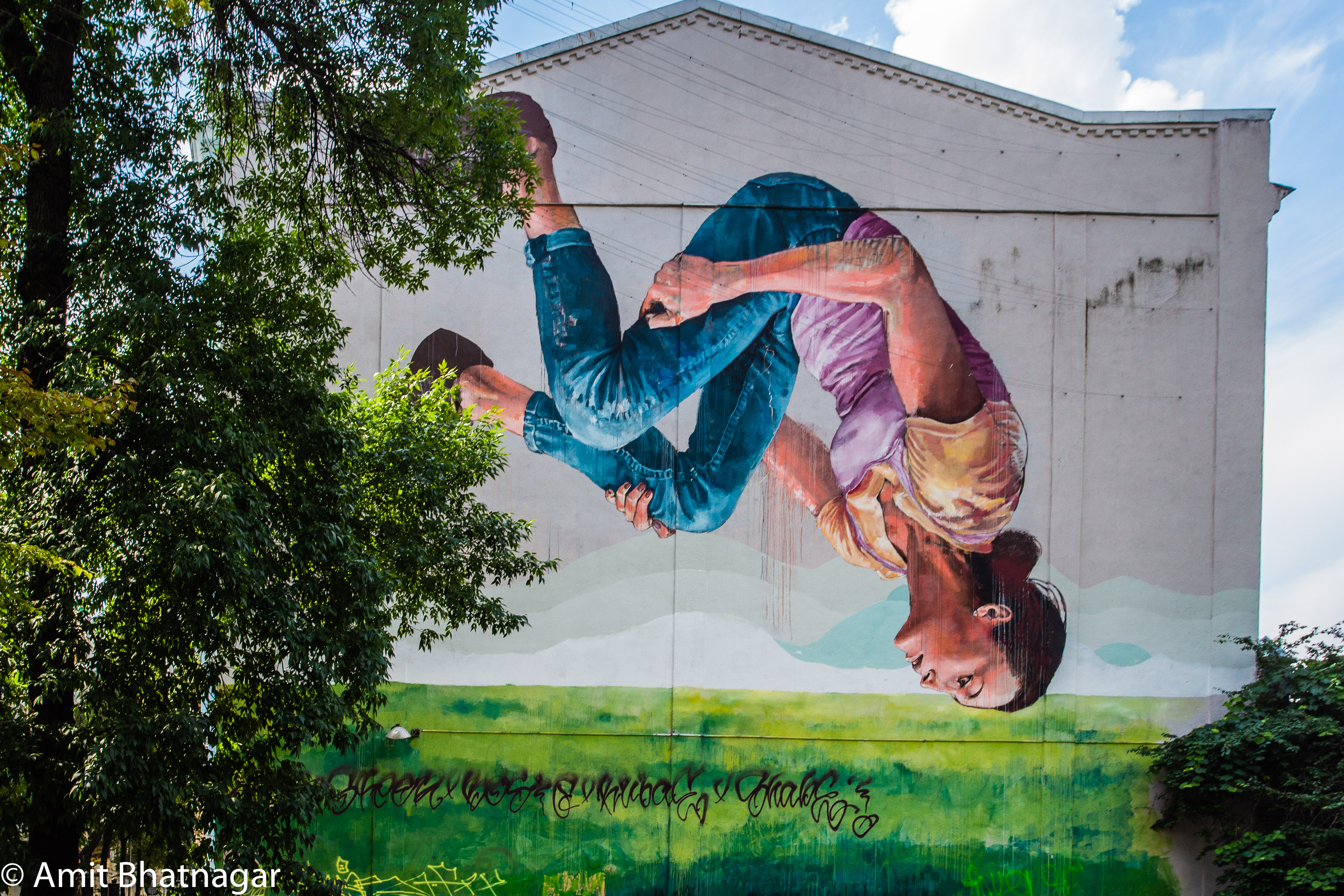 The walk from the Cathedral to my next destination, the Andriyivskyy Descent was full of surprises. The most noticeable thing is of course the street art. Full sides of multi-story buildings being painted in most colourful art. I was walking right past one such masterpiece and taking some pictures of some random buildings till an old lady who spoke no English pointing this out to me. Truly communication needs no language, she told me what I needed to see in Ukrainian, I didn’t get a word of what she said, I thanked her in English, she had no clue. But we both understood!