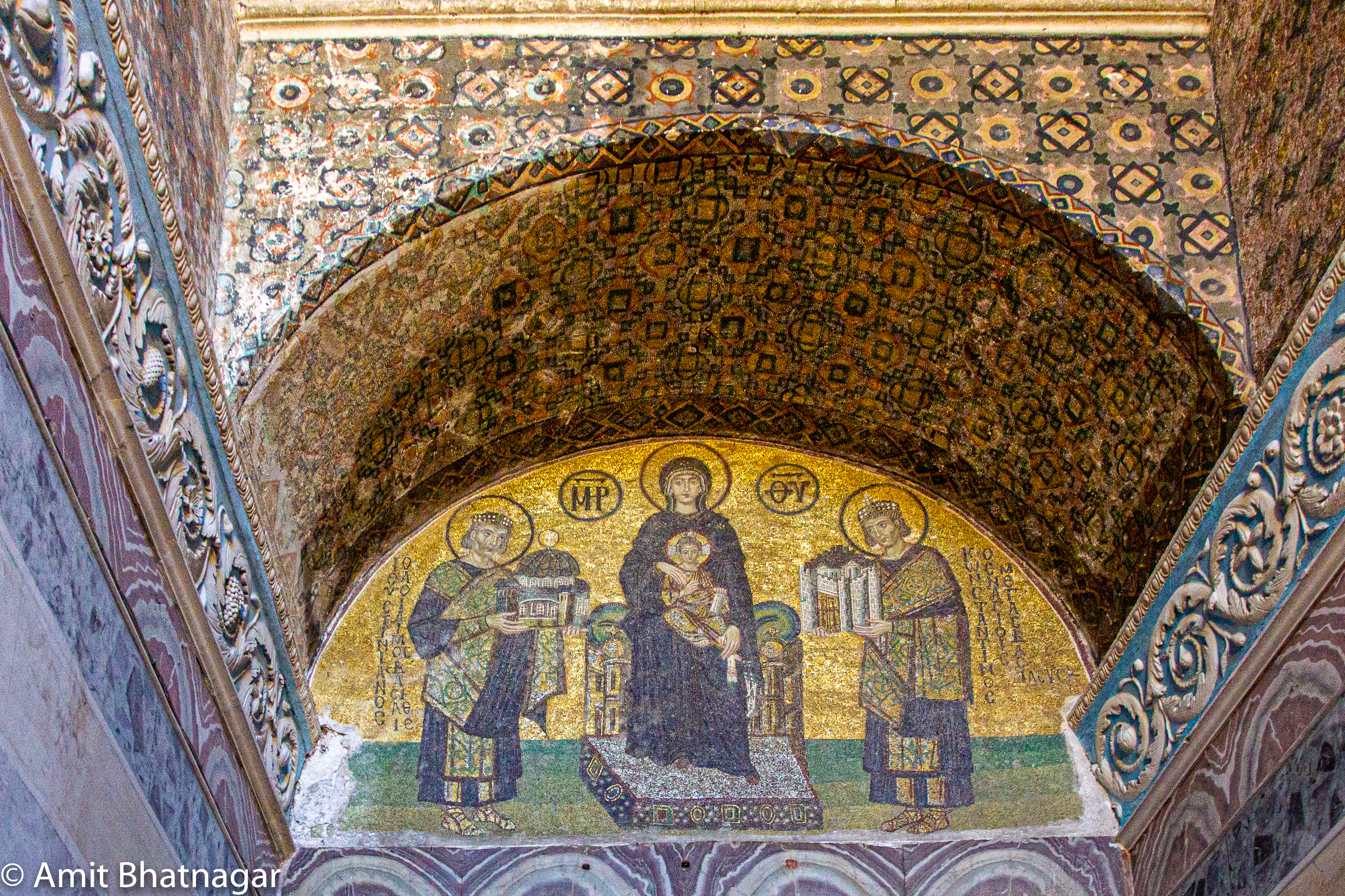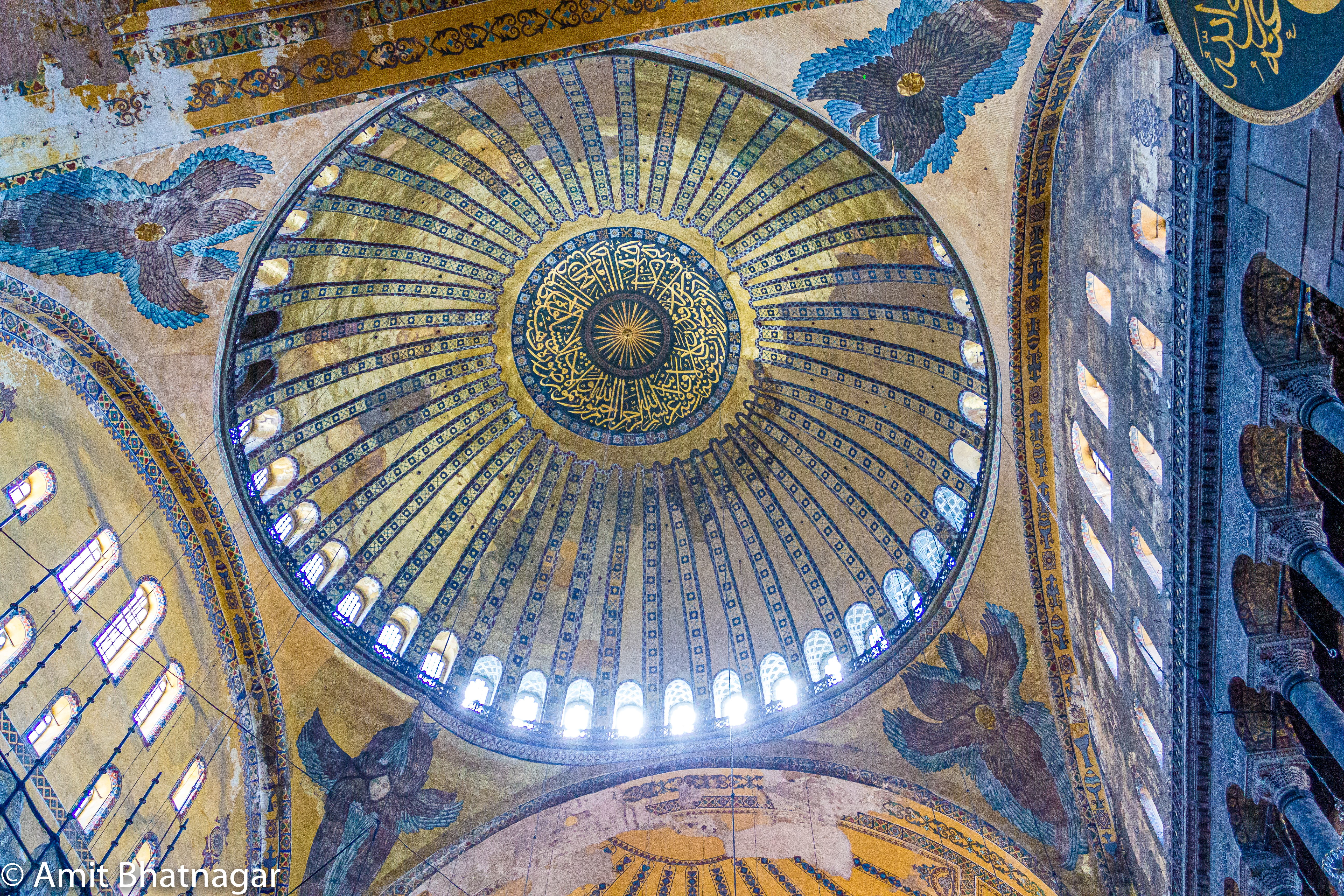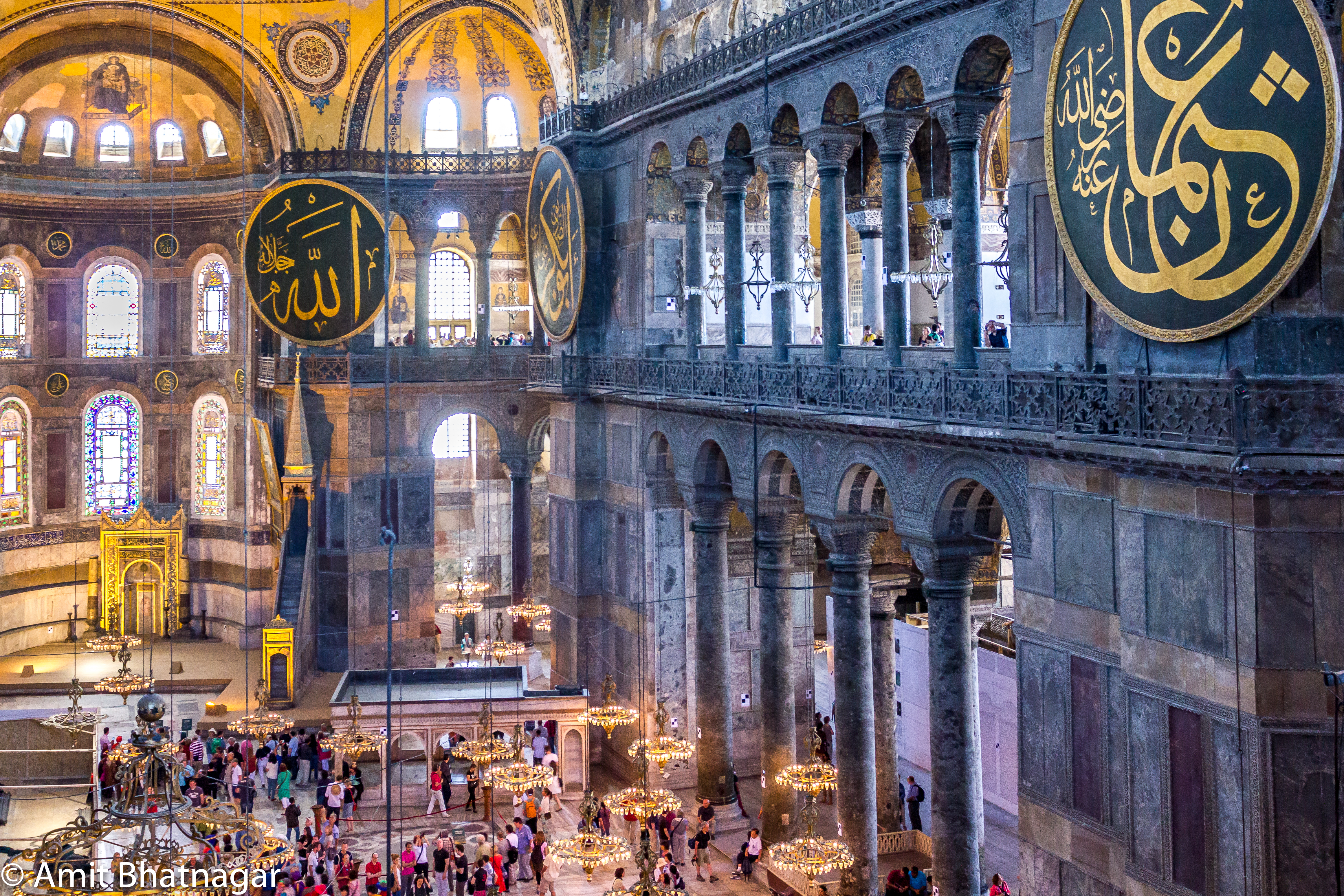 The inside of this historic icon easily makes all the jostling crowds worth your while. The entrance is a narrow passage with a very famous motif of Jesus on the top a memory from it’s near the 1000 year reign as the largest cathedral in the world from 537 AD to 1522 AD. It was an architectural wonder for its times with the largest dome constructed at the time and showcased the scientific capabilities of the Byzantine empire. Remains of paintings and other forms all wall art from its times as an Eastern Orthodox Cathedral still can be seen. For a few decades in the thirteenth century, it was converted to a Roman Catholic church the fourth crusaders. In 1453 it was converted to an Ottoman Mosque and remained that till 1931 when it was closed and reopened as a secular museum in 1935. The interiors tell stories of all phases of its life, the recent ones are more prominent, though the older ones hold their place firmly and tell deeper historic stories. The sheer scale of the interiors and the massive dome are mind-blowing especially when put together with the intricate multi-faith interior design. The lighting is very similar to the other major mosques of the city with chandeliers hung using long chains and natural light coming in through hundreds of glass windows around the domes. There are two levels and you can walk up to the first floor to see some historic art and also get some beautiful views of the ground floor and the artwork on the high ceilings.