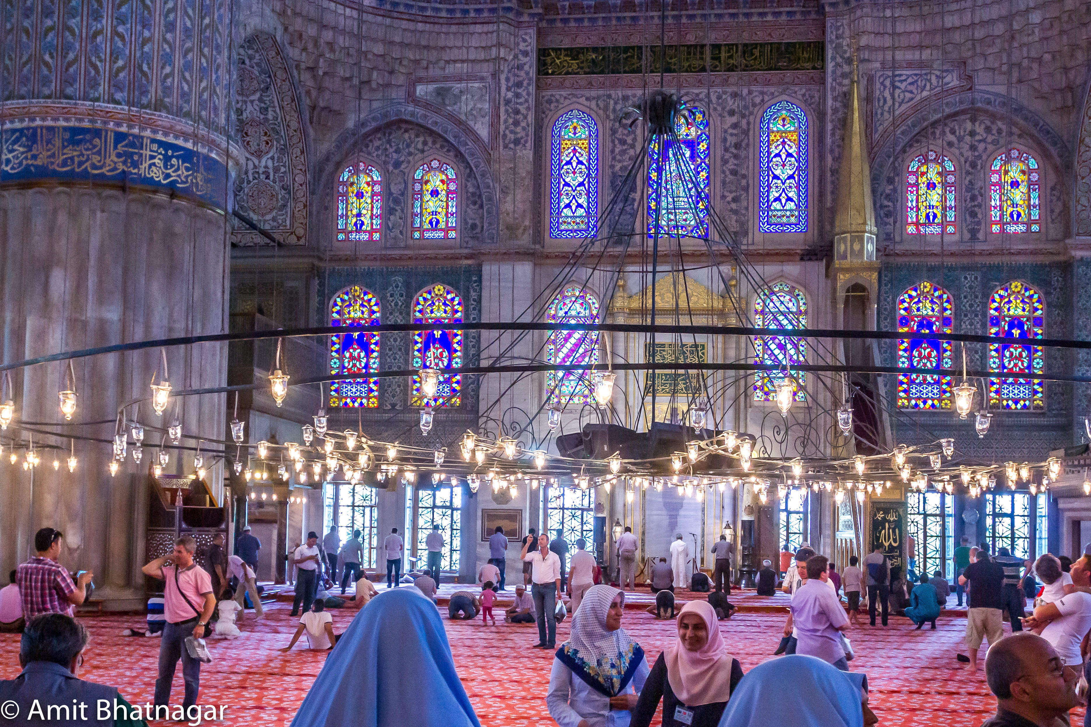What the Suleymaniye mosque lacks in brand recognition and stature, it makes up in beautiful architecture and design. The stature of a mosque in the Ottoman times was defined by the number of minarets it had. Six meant you were at the absolute top, four could be built if the mosque was built but a sultan. Princes could authorize two and everyone else had to stick to the functional one. The Suleymaniye has four, that would make it stand out anywhere in the world, except Istanbul where it sits about a mile away from the Blue Mosque, with six. The stone used to build the mosque is unique and gives it a bit of an extra-terrestrial feel. The entrance is through a grand courtyard with the traditional water fountain at the center. The inside is a very traditional Turkish style of colorful geometric lines with colored glass windows providing natural light supplemented by chandeliers hung or long chains. The visitor entrance is separate from the worshiper entrance and provides a good side space to be able to click pictures of the vast interiors – remember to dress conservatively if you want to enter.