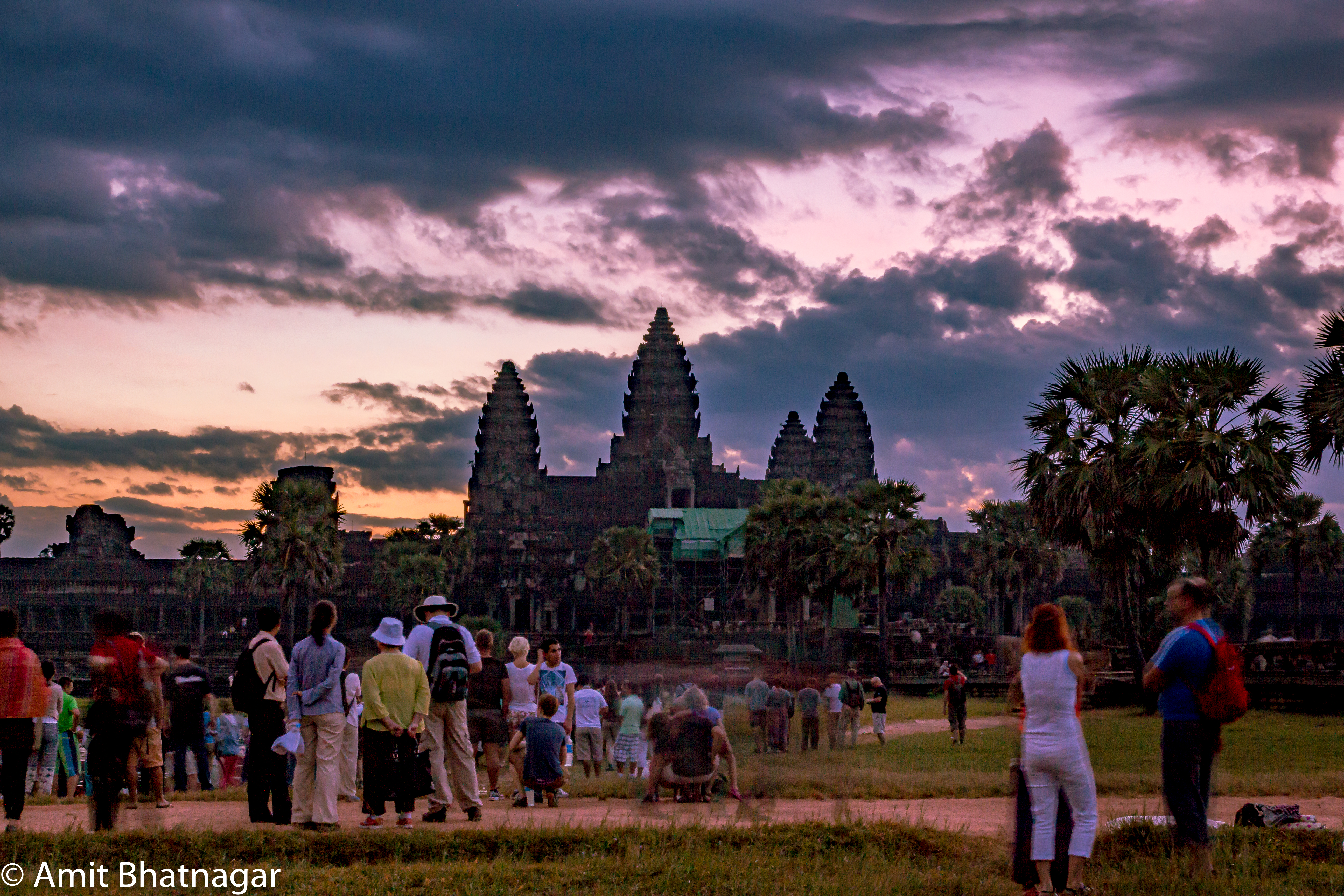 Hundreds of pairs of eyes waited for the Sun to rise. The moment the first light of day hit one of the many clouds in the sky, magic happened. There were tinges of purple and red in the sky as the temple started glowing in the light. As the day got brighter, the colors change and became more magical until the first ray of yellow light emerged from over the structure of Angkor Wat. This process had taken over 30 minutes and I had probably clicked 40-50 pictures in the time. Every minute was a new type of beautiful sky! Once the Sun emerged from behind the temple, there was a mesmerizing minute when it appeared as a halo to the temple but then the colors disappeared and it was just a grant temple on a hot day. The early morning ritual was worth the effort – it was something not to be missed.