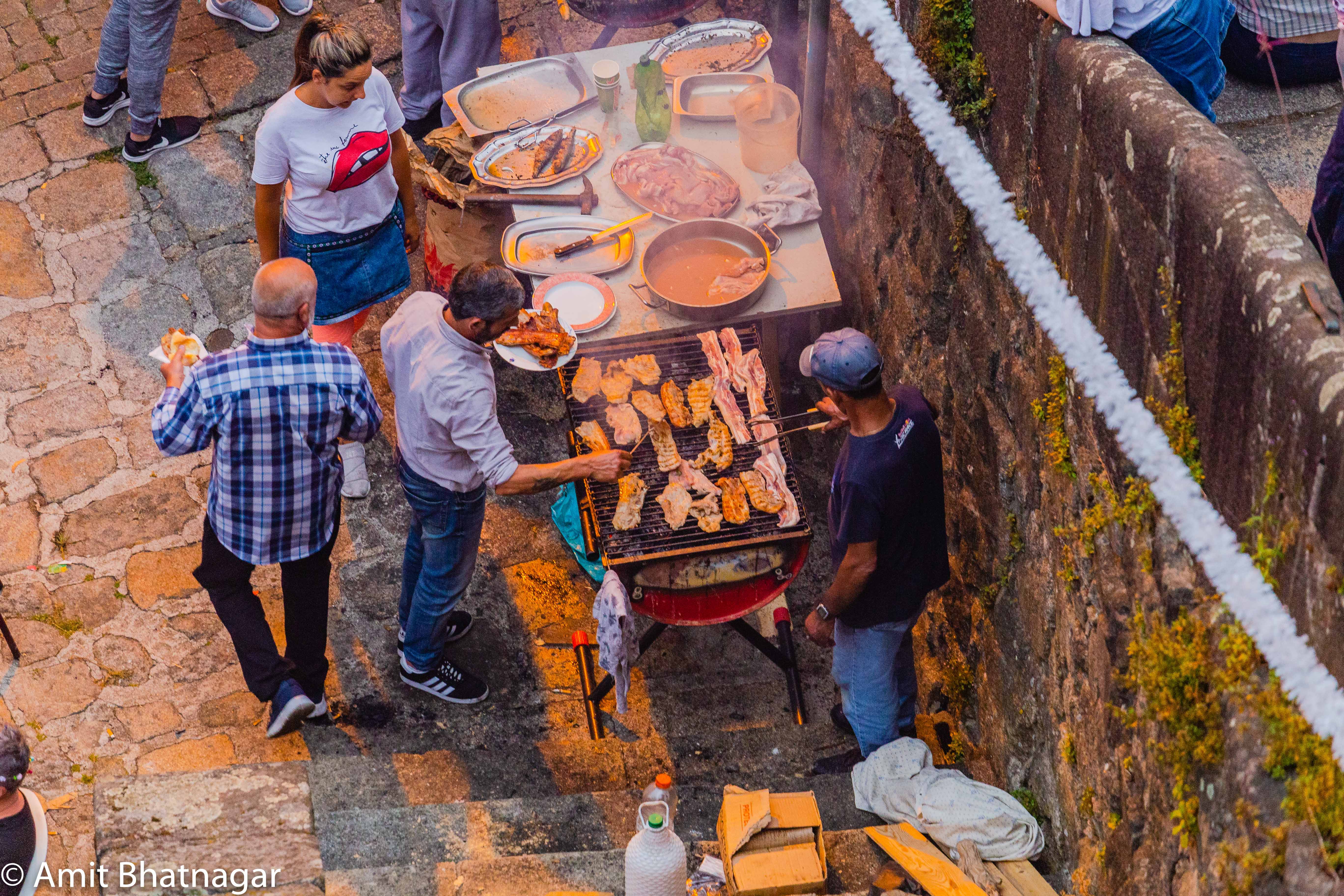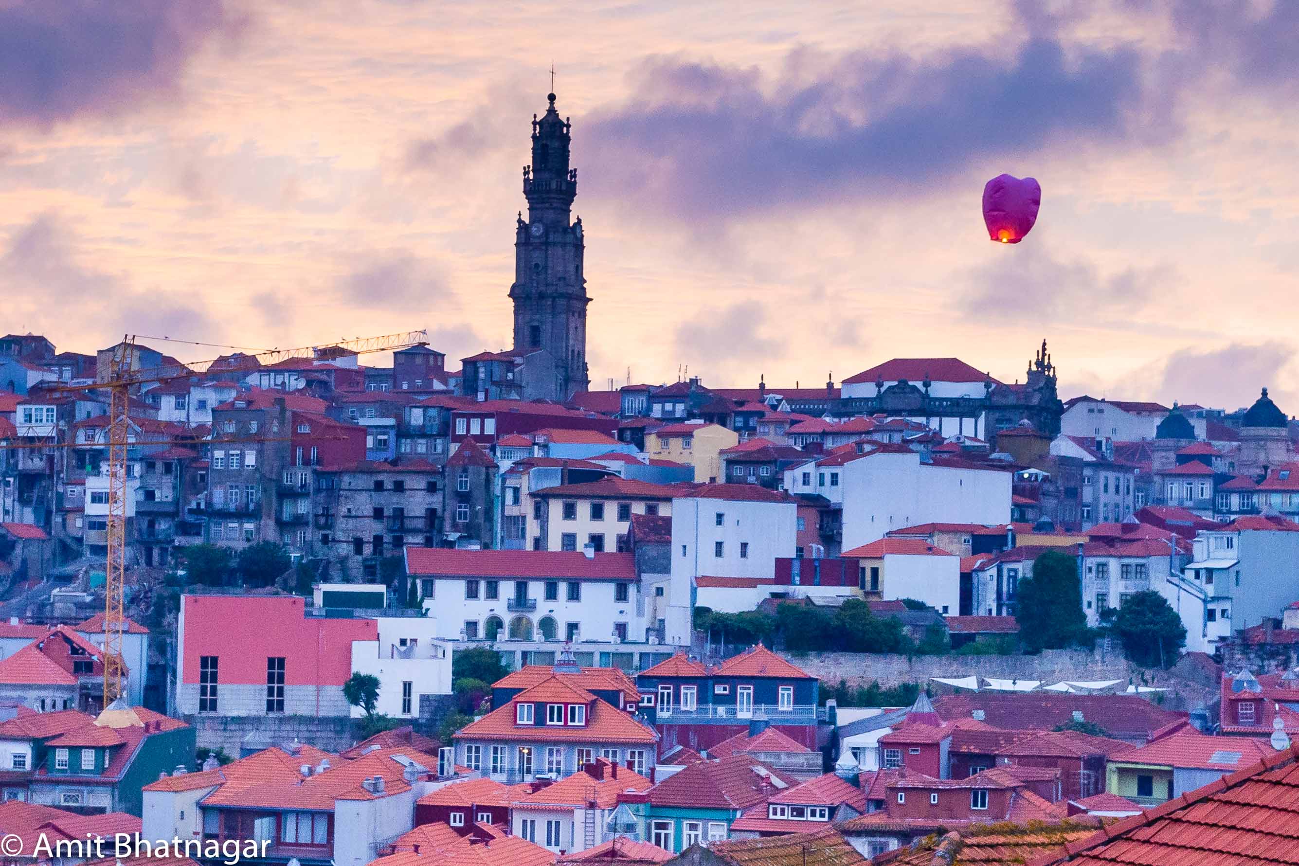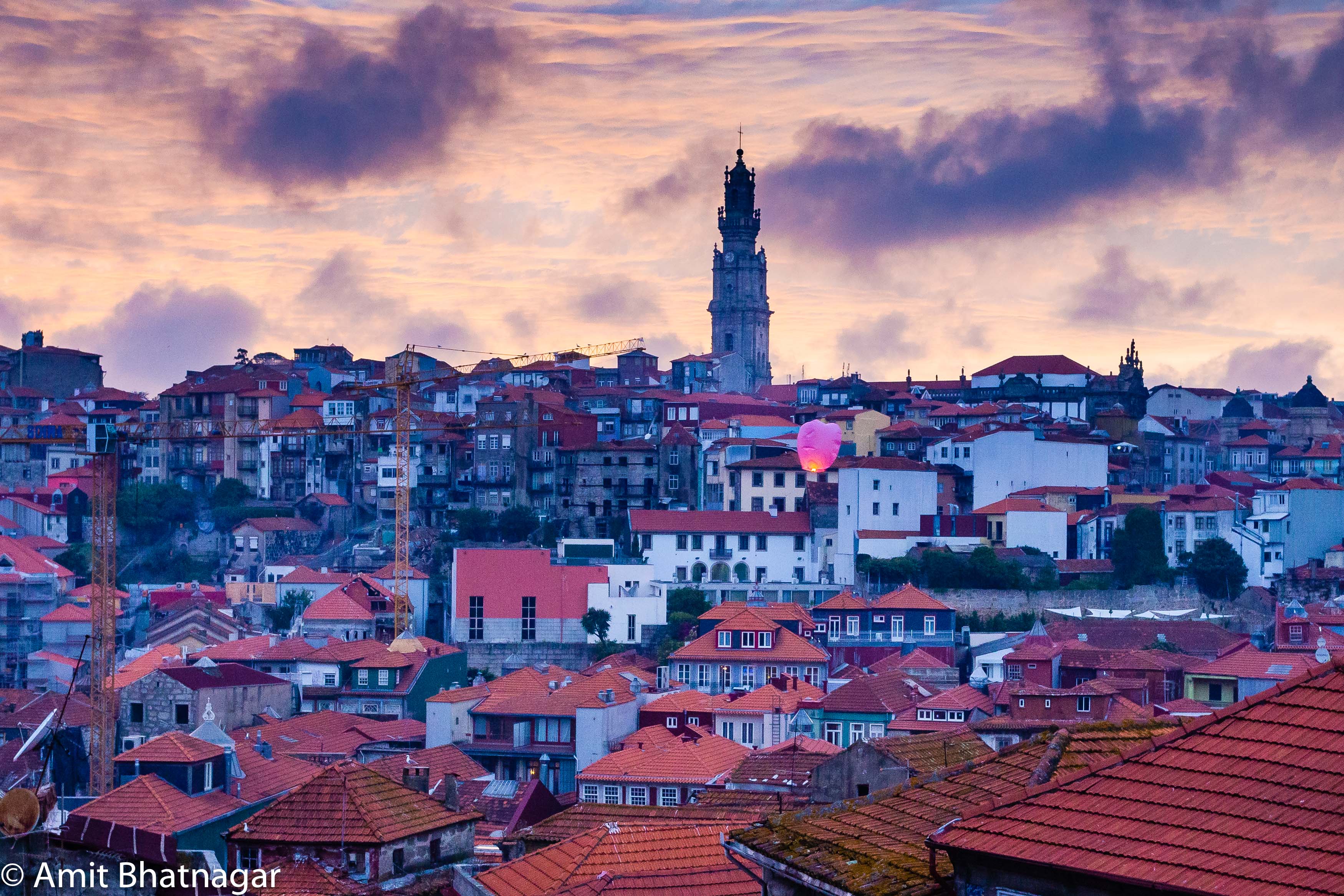 We walked across the Dom Luis bridge earlier in the evening to see the crews doing final checks on the firework being set up on the side. It was full of people passing by and tapping each fellow reveler with the toy hammer. It was a fantastic walk with a great view of the river and the party starting to pick up steam. The crowds around the river got really heavy and we moved further away from the area into the area around the Porto Cathedral. We spent a bulk of the time in the area around the Porto Cathedral – which offered a stunning view of the sunset and the first sights of hot air lanterns flying over the red-roofs of the Porto skyline. We had an early dinner in a restaurant servicing food on roadside tables. The food (obviously Sardines) was good, but just the energy of the area made it even more enjoyable. We hung around well past midnight to enjoy the liquor, music, colorful skies