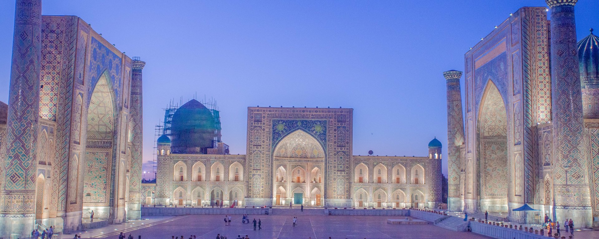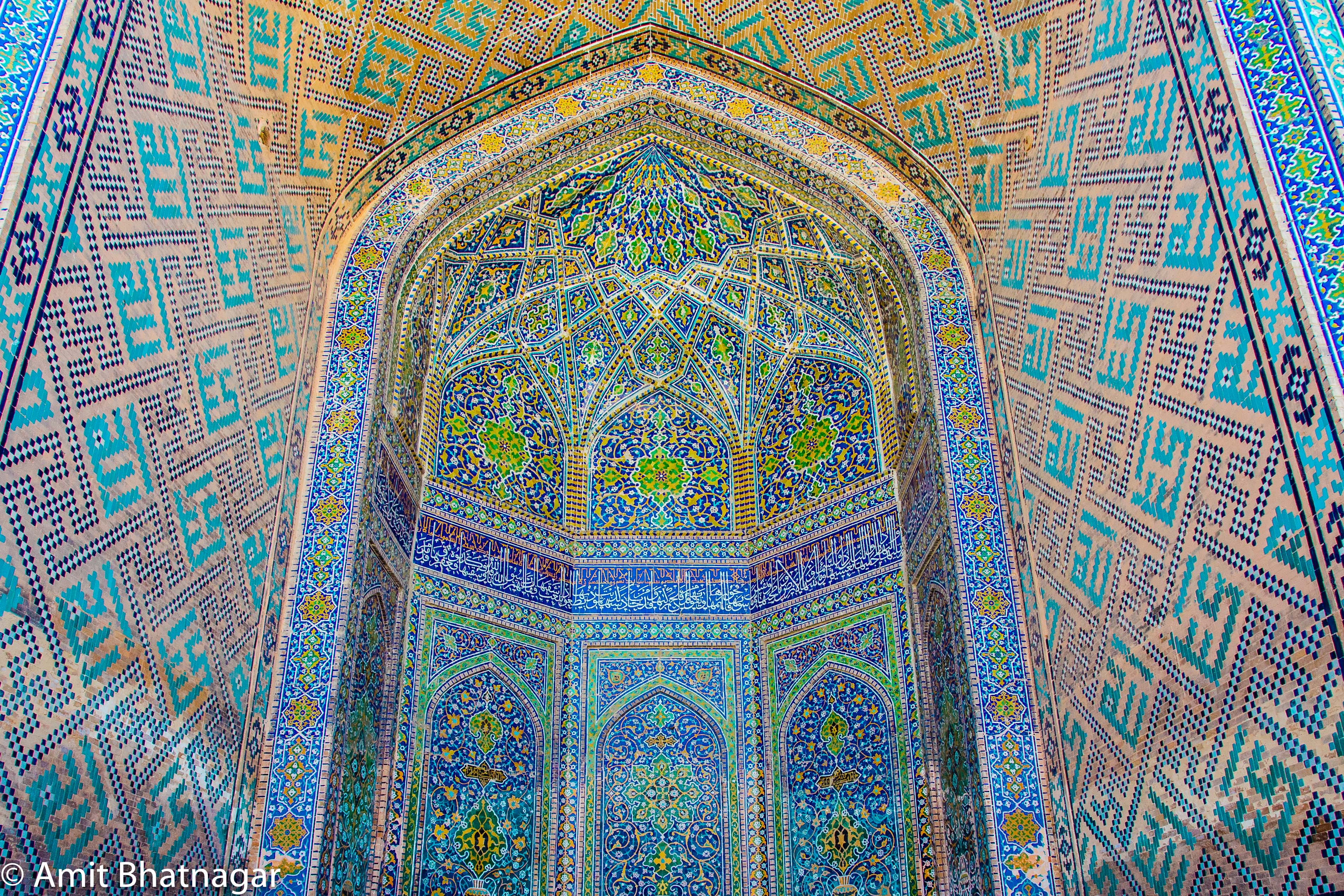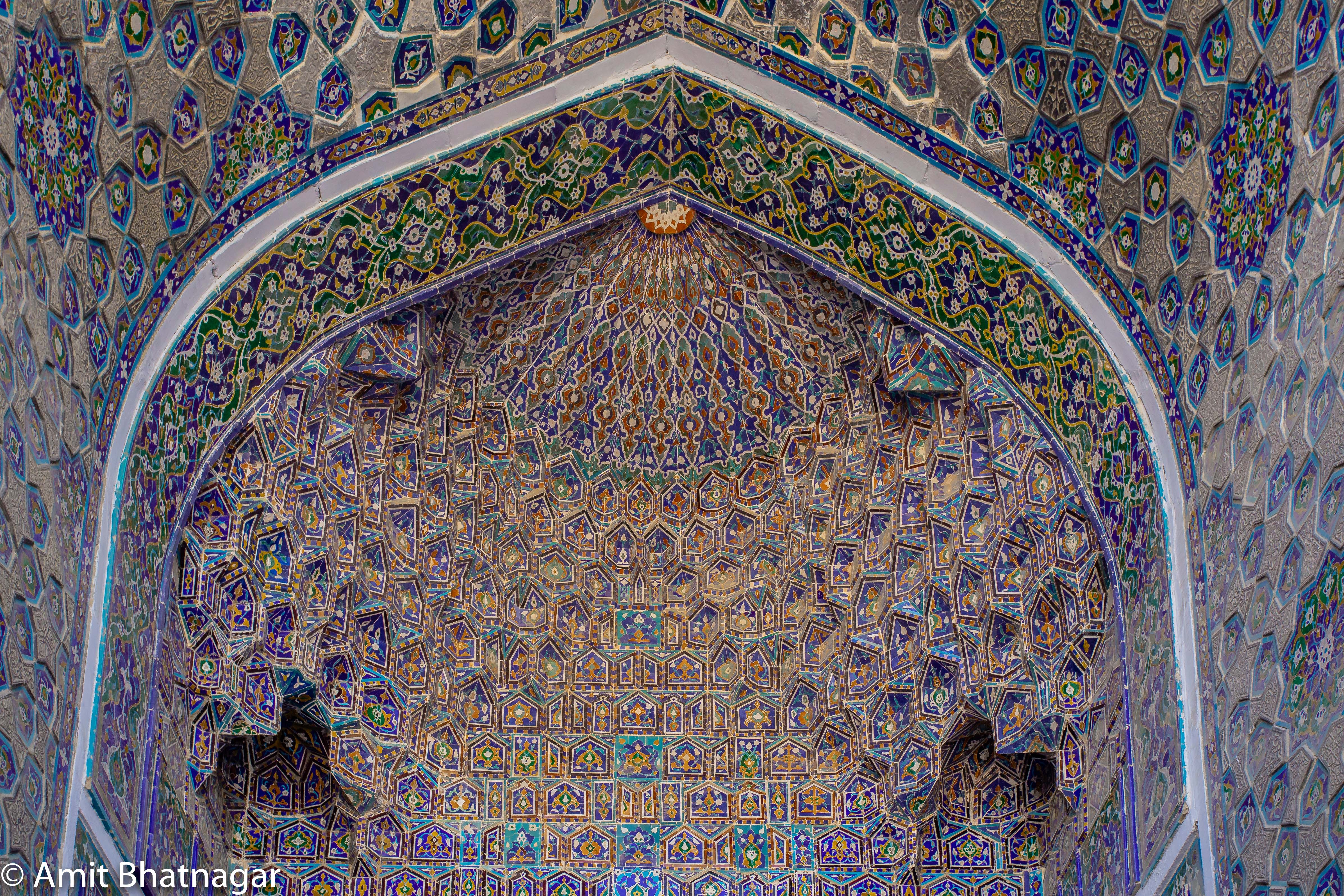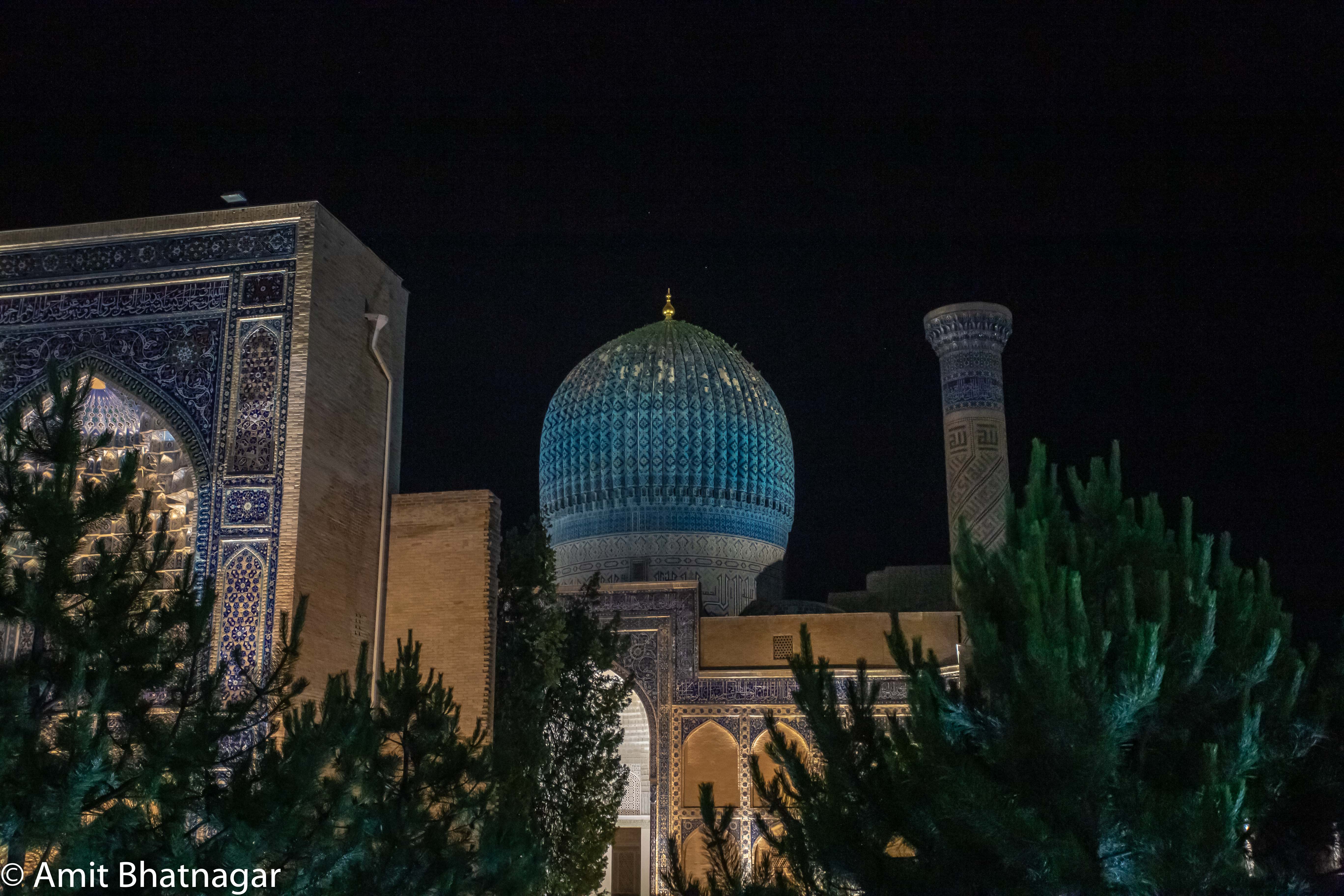 A 15-minute stroll from Gur-e-amir led to the highlight of the trip – the unbelievable Registon Square (pronounced more like ‘registaan’ – desert, in Urdu). The square formed by three madrasas defies imagination in terms of scale, architecture, and level of detail in the designs all around. The madrasas were built at different times, spanning some 200 years, but to the untrained eye would seem part of a well-laid plan. Each of the madrasas has more to show off inside with some amazing courtyards and roof inlay work. The true charisma of the square though was visible when we came back in the evening. As the sunset, the structures stood out even more, and then at 8 pm, magic happened! The lights turned on and the crowd sitting on the stairs watching let out a small gasp, in unison. Some of the pictures do little justice to how the empty square looked in the night with some well-planned lighting and deep blue sky. Built between the 15th and 17th centuries, the massive facades make their quiet case for being called a wonder of the world.