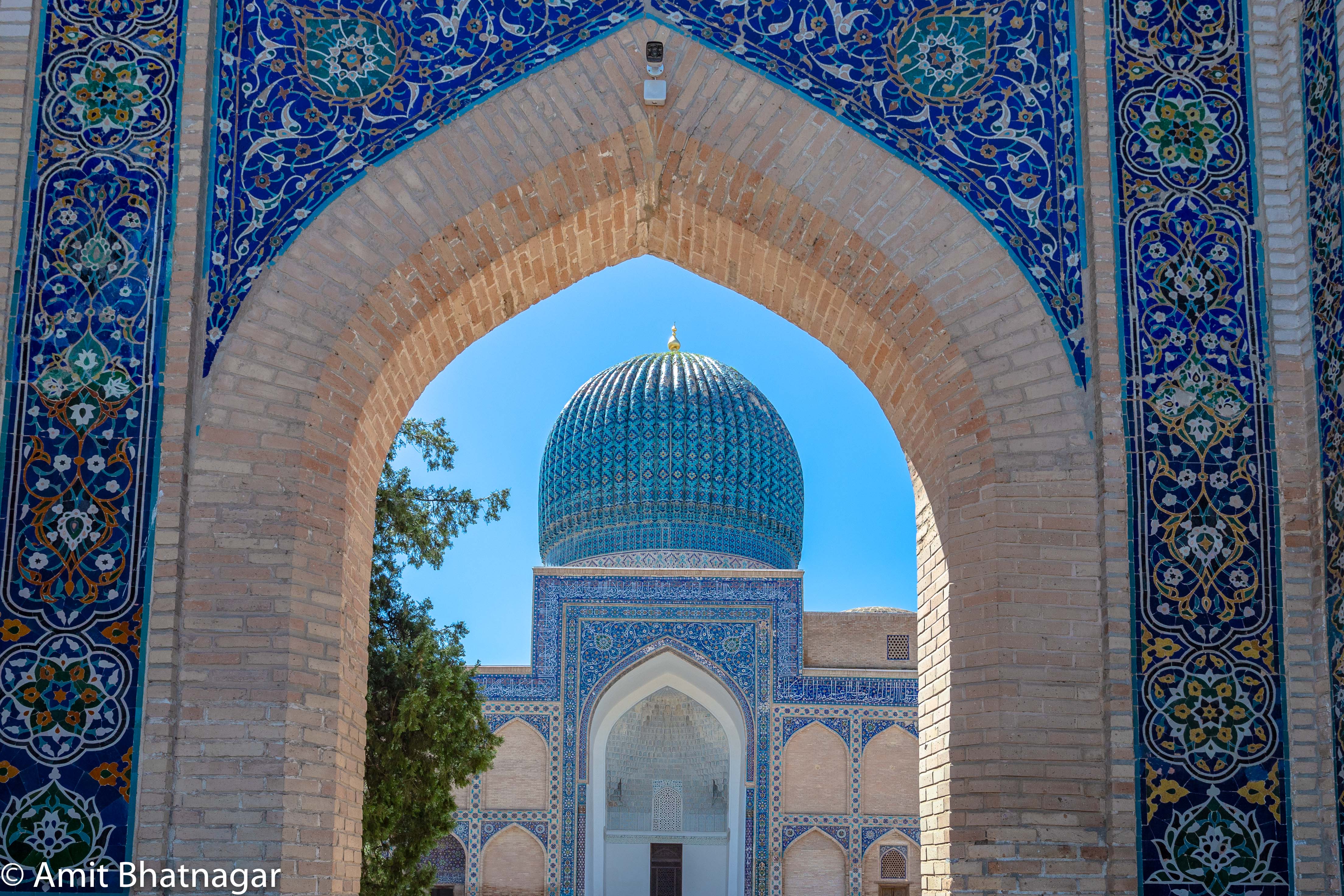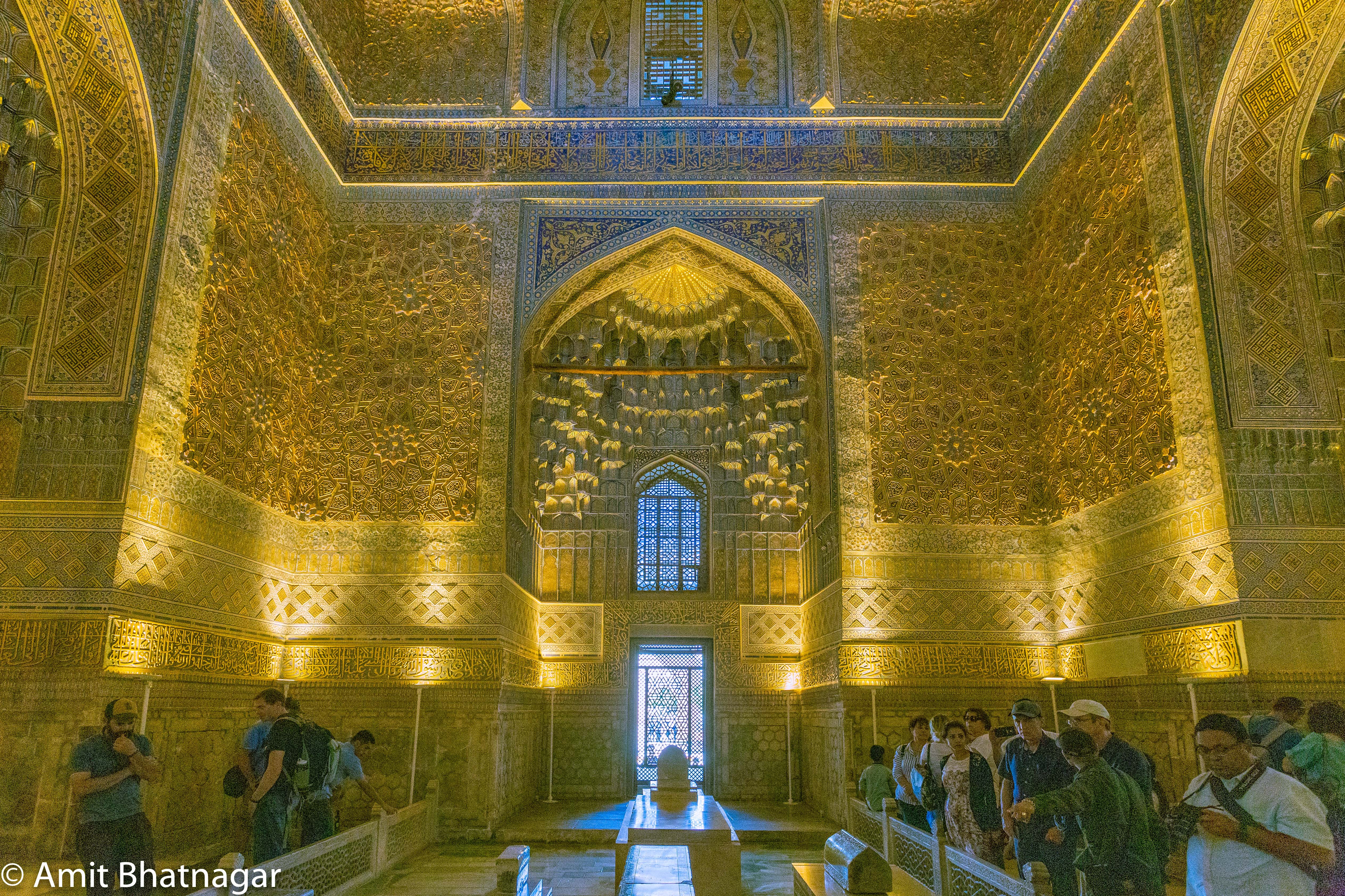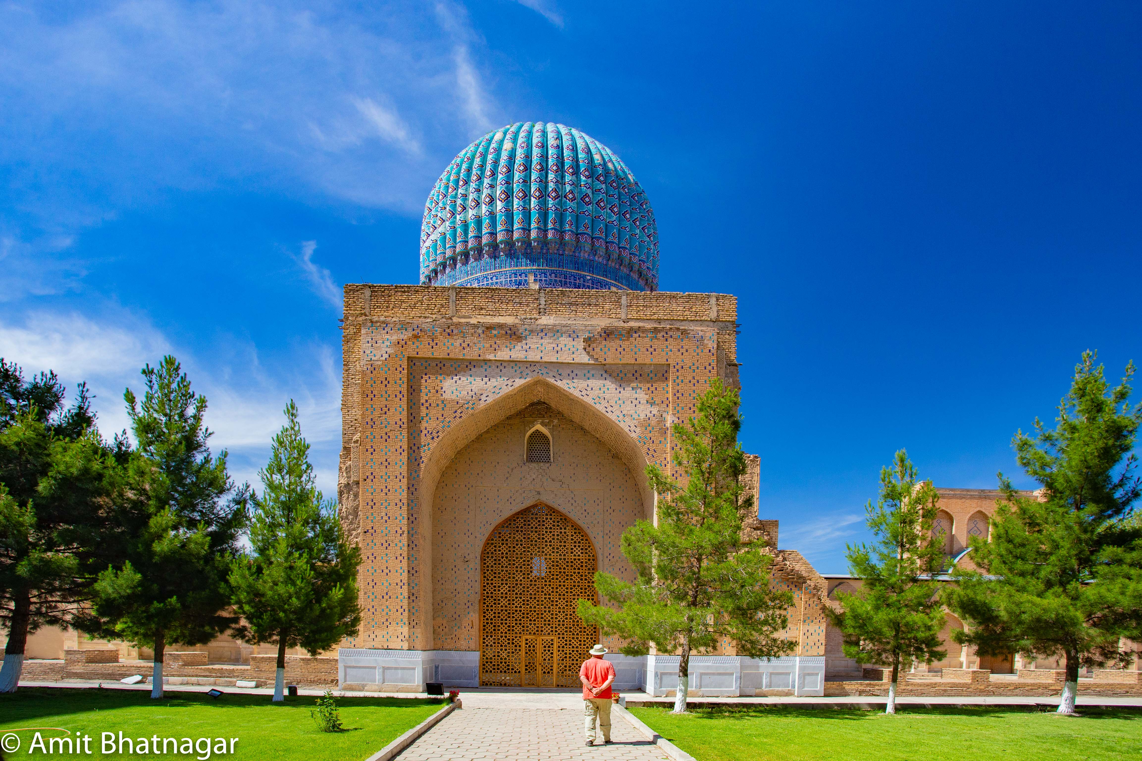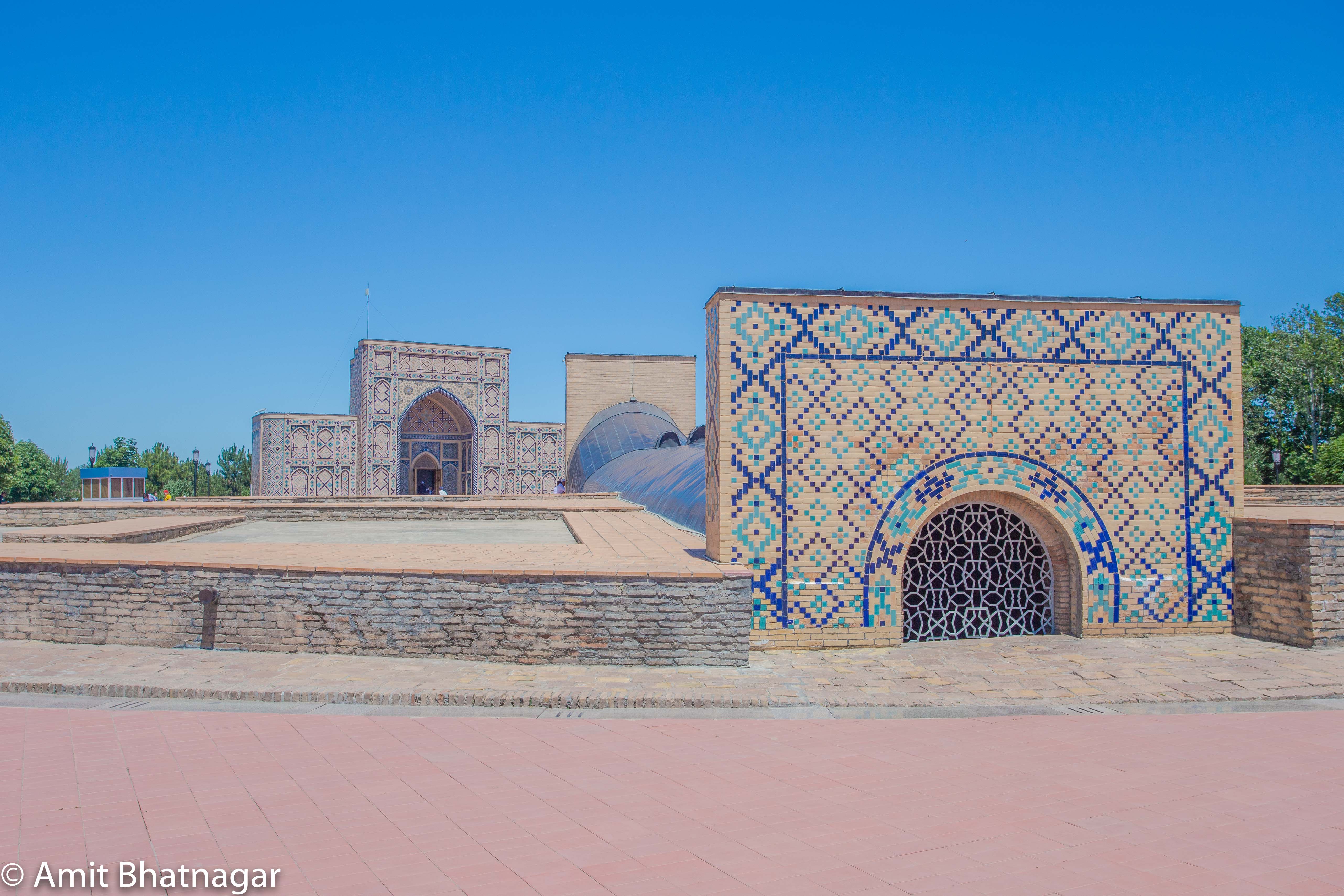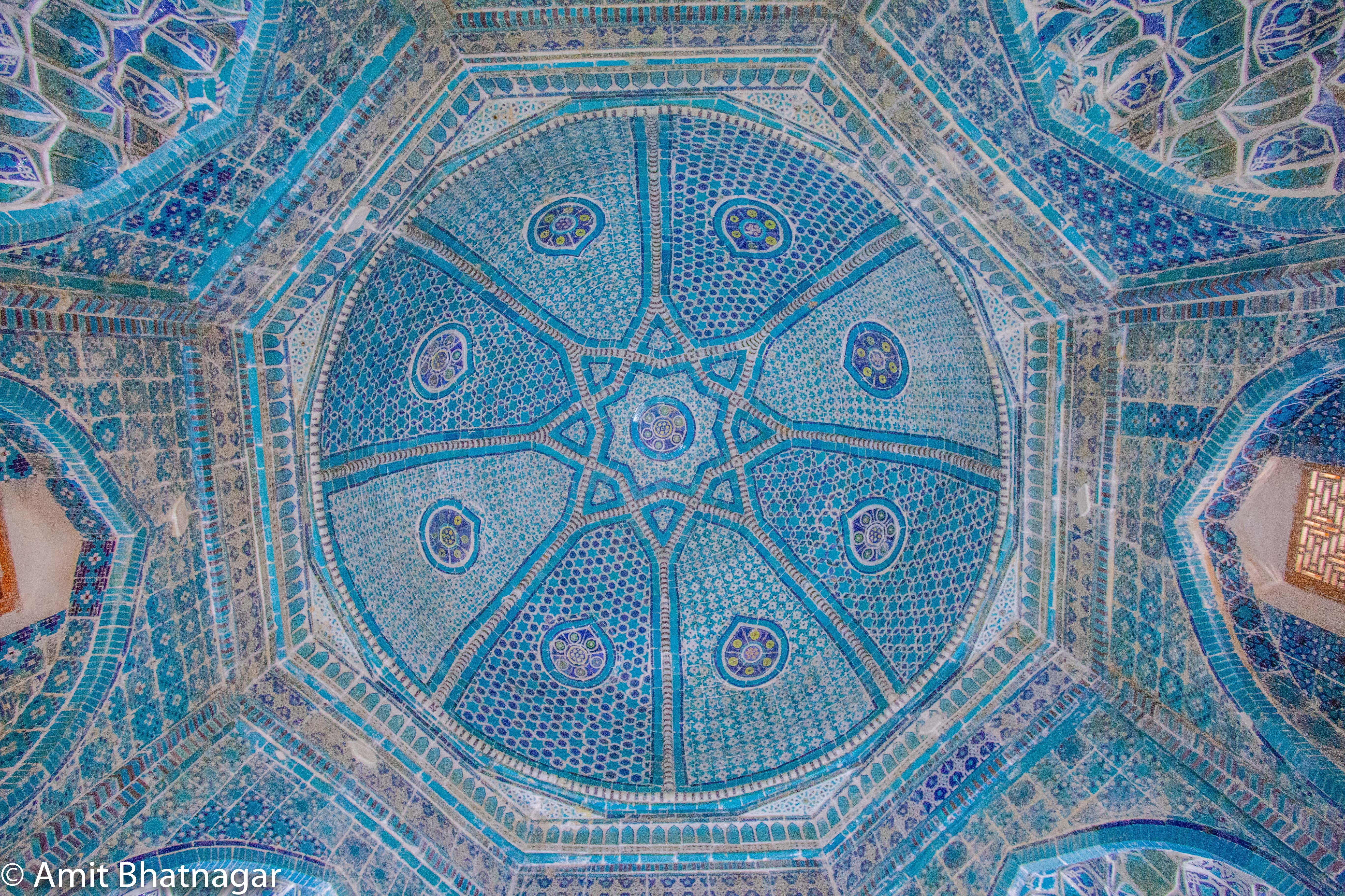 We started our day with a short walk to Gur-e-Amir or the mausoleum of the Amir – Timur himself. The man whose campaigns globally are believed to have killed about 5% of the world’s population at the time is locally considered a benevolent king and a national hero. His smiling statues and pictures can be seen around the city. He was known to create piles of decapitated heads once he conquered a city but he died of a meek illness while waging war against the Chinese. It wasn’t planned that he would be laid to rest in Samarkand but such was his fate. The mausoleum itself befits the king it houses. It is architecturally beautiful and showcases the blue ceramic arts in the area. Even the interior is ornately decorated where artificial graves rest in a magnificent golden and blue decorated room. The real graves are in a basement chamber that is off-bounds for visitors. This overall design is believed to be the inspiration for the Taj Mahal, centuries later – though the inspired is far grander than the inspiration.